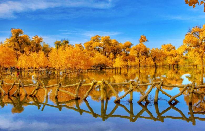 胡杨这是一个神奇的树种,它的生长总是和凤凰与鲜血紧密相连,这是一个多变的树种,春夏为绿色,深秋为黄色,冬天为红色,这是一个坚强的树种,“活着一千年不死、死后一千年不倒、倒后一千年不朽”。