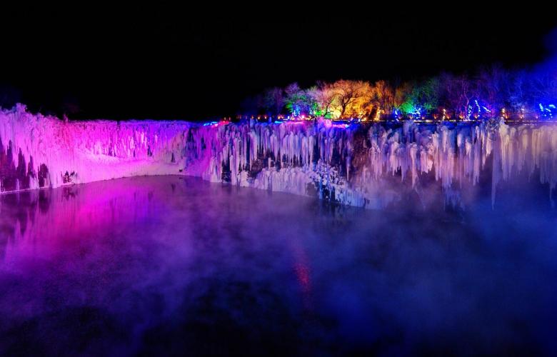 【冰雪大世界】,在霓虹灯的装饰下,冰雪大世界的冰雕更加多彩、透明。大家可以尽情拍照玩耍,还能观看冰雪表演呐!