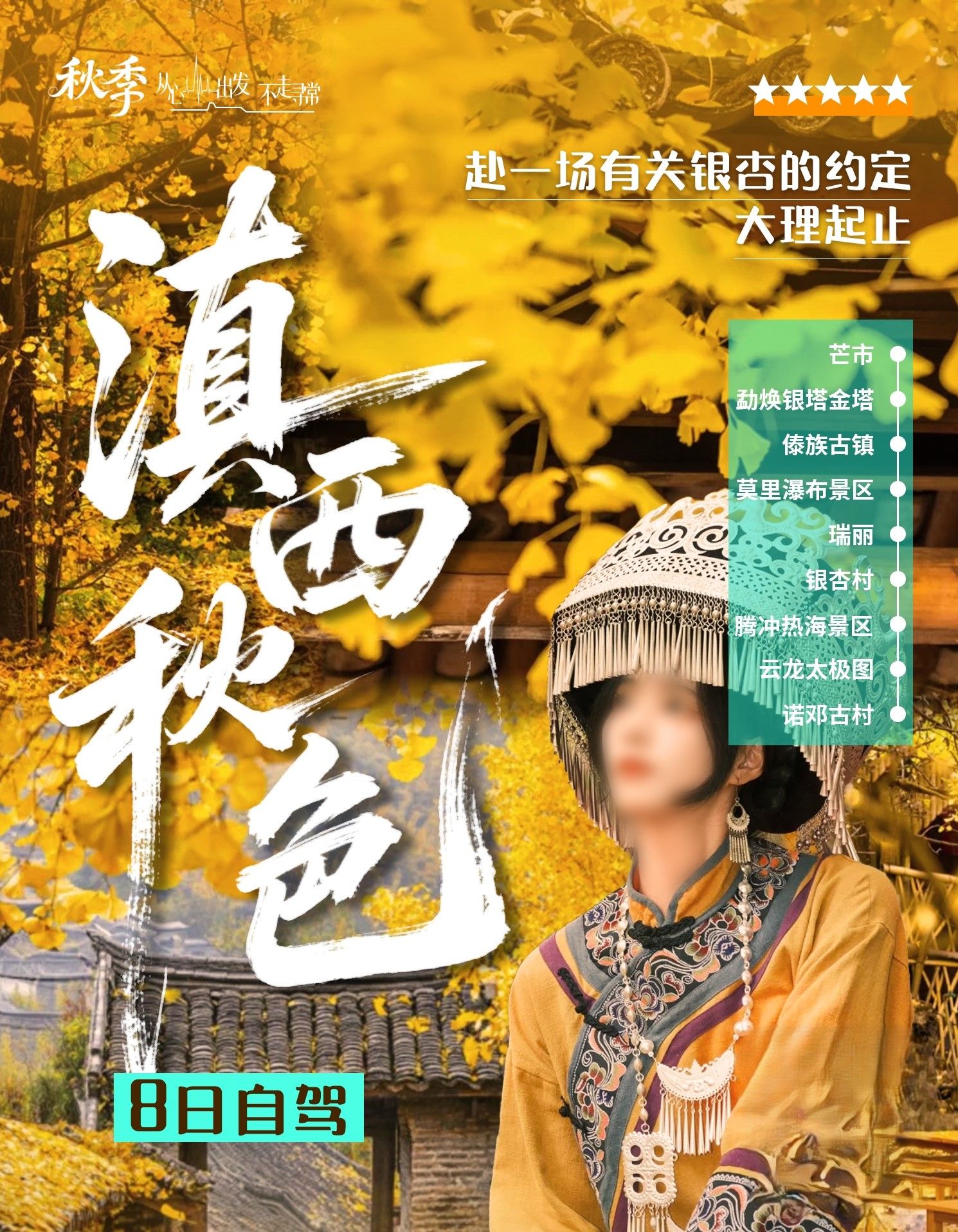 大理集结云南滇西8日自驾游:【滇西秋色】大理-芒市-瑞丽-腾冲银杏村-热海-云龙太极图8日游